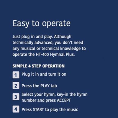 The Digital Hymnal contains an extensive repertoire of hymns (and incidental music) that can be used in most Christian denominations/churches. These hymn tunes can be accessed either using the onboard, easy to use, search feature or the supplied A-Z Master Index book. Once the hymn has been selected, the digital hymnal user will determine the music style (choosing from over 200 presets) and apply it to the hymn, whilst at the same time selecting the tempo (speed), pitch and number of verses. Once the settings have been made, the selection can be stored in a new playlist in readiness for your service. The digital hymnal system provided by Hymn Technology is known as the HT-400 US, a unique device that anyone can use to replicate traditional pipe organ church music and many other musical styles